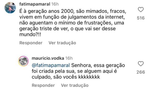 “É a geração anos 2000, são mimados, fracos, vivem em função de julgamentos da internet, não aguentam o mínimo de frustações, uma geração triste se ver, o que vai ser desse mundo”?, comentou Fátima Amaral. O comentário resposta de Mauricio faz ainda mais sentido quando busca-se entender um pouco mais sobre os pais de Vanessa Lopes, e aí então, há uma certa compreensão do porquê talvez a garota agiu assim. A questão é que a sociedade está e sempre esteve procurando culpados para suas questões mal resolvidas.