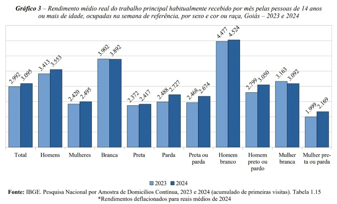 O último levantamento do Instituto Brasileiro de Geografia e Estatística (IBGE), fazendo a relação sexo com a cor ou raça, se mostra perceptível a dupla desigualdade. Em Goiás, no ano de 2024, os homens brancos (R$ 4.524) apresentaram rendimento médio 2,1 vezes maior (108,6%) que as mulheres pretas ou pardas (R$ 2.169). Embora ainda seja alarmante, a desigualdade era maior em 2023, com a diferença entre os números chegando a 124,0%.