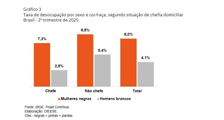 A taxa de desocupação entre as mulheres negras é o dobro em relação a de homens brancos: 8,0% contra 4,1%. Quando ambos são chefes de domicílio, a diferença é ainda maior.