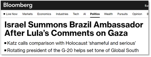 A TV e agência de notícias dos EUA informou que o embaixador brasileiro em Israel foi convocado depois das falas de Lula. O texto relatou a importância de Lula na América do Sul e a presidência brasileira do G20.