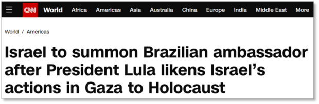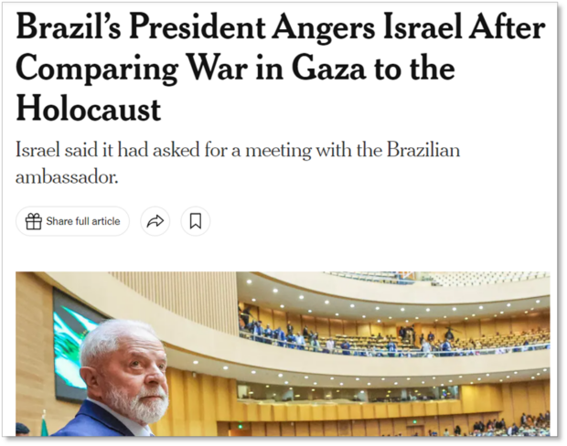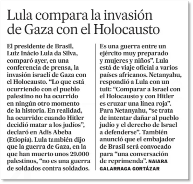 O jornal diário israelense relatou as falas do presidente brasileiro e afirmou que, com as declarações de domingo (18.fev), Lula se tornou “um dos primeiros líderes ocidentais a fazer uma comparação tão direta em meio a alegações de genocídio”. Destacou as reações dos líderes israelenses e as medidas adotadas, como a convocação do embaixador brasileiro no país.
