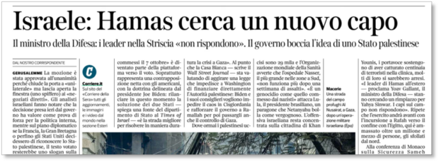 Em uma reportagem sobre a busca do Hamas por um novo líder, publicada na edição impressa desta 2ª feira (19.fev), o jornal italiano Corriere della Sera citou a acusação de genocídio feita por Lula e a resposta de Netanyahu.