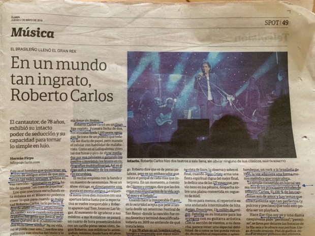 Na terça-feira, 30 de abril, não sobrou uma poltrona vazia, no show do Gran Rex. O público não hesitou em pagar 97,50 reais (1.100,00 pesos). O crítico Hernán Firpo anota que Roberto Carlos, de 78 anos, “é um homem íntegro e respeitado” e menciona sua voz como “doce e tristonha”. “Lady Laura” e “La Distancia” provocaram nova choradeira do público. “Jesús Cristo” e “Detalles” encantaram a todos, que pareciam mesmerizados.