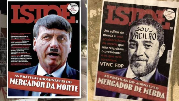 Mas os ataques cerrados à revista, no mundo virtual, são também incitações à violência física. Supostos milicianos — e não há como não lembrar os “milicianos” de Hitler — picharam a sede da revista, na quarta-feira, 20, e colaram cartazes com a fotografia de um dos proprietários. Nos cartazes — simulando a capa da revista — está escrita a frase “sou vacilão”. O “título” é “mercador de merda”. Se a “IstoÉ” excedeu — talvez por tentar transmitir a indignação nacional com o governo de Bolsonaro —, os bolsonaristas excederam ainda mais. E, afinal, quem pagou pelos cartazes?