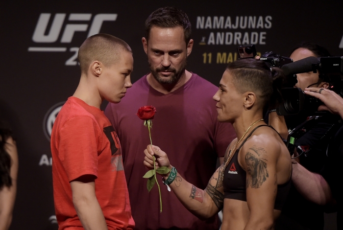 Ao perceber que, lutando no campo de Rose Namajunas, o bate-afasta — uma operação de fustigamento, que desgasta —, não dava para ganhar, Jéssica Andrade decidiu partir para o estilo em que se consagrou e, até, deu-lhe o apelido: levantou a americana, com facilidade, e jogou-a no chão.