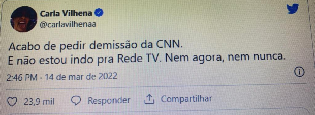 “A CNN Brasil comunica que a jornalista Carla Vilhena, apresentadora do telejornal Visão, desligou-se da empresa nesta segunda-feira (14/3). A CNN agradece à profissional pelo empenho e talento dedicados ao canal e deseja todo sucesso sem sues próximo desafios profissionais.”