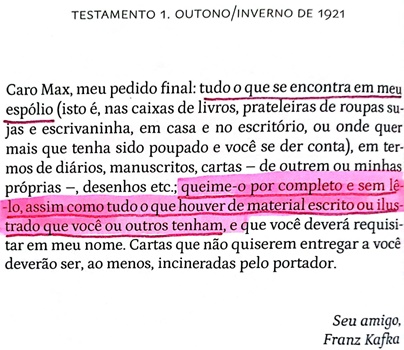No primeiro testamento, de 1921, de apenas algumas linhas, Kafka é enfático — “Caro Max, meu pedido final: tudo o que se encontra em meu espólio, (…), em termos de diários, manuscritos, cartas, desenhos, queime-o por completo e sem lê-lo, assim como tudo o que houver de material escrito ou ilustrado que você ou outros tenham”.