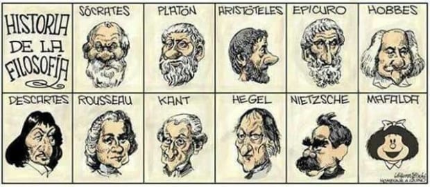Quanto ao que seria possível dizer aos sujeitos que estão como candidatos no pleito atual, também me veio uma inspiração. Justamente no momento em que eu escrevia esse texto, uma amiga me enviou outra tirinha, na qual a Mafalda figura, numa galeria de fotos dos grandes filósofos da humanidade. E eu bobamente pensei: Por que o rostinho da Mafalda e não o do Quino? Mas é justamente aqui que se encontra a dica. O que fica é o valor de nossas obras, sobretudo se qualificam o pensamento, as artes, a educação, a saúde, enfim, a vida para todos. E o pai, como função, continua a ser importante, porém como “não todo poder”, como o chaveiro ou o pai da Mafalda.