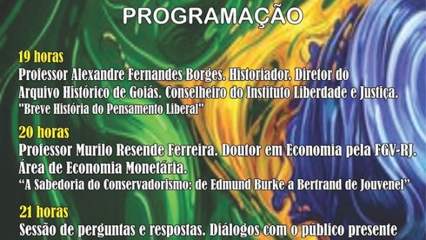 “Breve história do pensamento liberal” é o tema de Alexandre Borges, historiador e diretor do Arquivo Histórico de Goiás. “A sabedoria do Conservadorismo: de Edmund Burke a Bertrand de Jouvenel” é o tema de Murilo Resende, doutor em economia pela Fundação Getúlio Vargas-Rio de Janeiro.