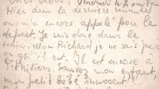 A pequena carta de Esther diz: “Meus queridos, ontem, no último minuto, me chamaram para o transporte. Me obrigaram a subir no trem. E não sei o que aconteceu com meu Richard. Todavia, ele está em Pithiviers. Salvem meu menino, meu bebê inocente! Como estará chorando. Nosso sofrimento não é nada. Salvem meu Richard, meu pequeno querido! Eu não posso escrever. Meu Richard, minha vida, está longe, e ninguém está protegendo o meu pequeno de 2 anos. Morrer, depressa, oh, menino meu! Devolvam-me o meu Richard. Esther”.