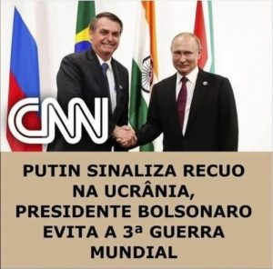 Naquele dia 15, uma postagem particularmente agitou as redes: era o ex-ministro do Meio Ambiente, Ricardo Salles – pré-candidato a uma vaga no Senado ou na Câmara – publicando uma imagem de um aperto de mãos entre os dois presidentes, com os dizeres “Putin sinaliza recuo na Ucrânia, presidente Bolsonaro evita a 3ª Guerra Mundial”. Detalhe importante: na foto estava a logo da CNN, um dos maiores conglomerados de comunicação do mundo.