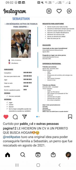 Com aquelas características, os animais aprendem e acumulam experiências. E foi com esse conhecimento que a Red 4 Patas, de Buenos Aires, Argentina, criou um currículo para um cão — Sebastian — que está em busca de uma família que o ame. Criaram um texto para ele em primeira pessoa, dizendo em língua espanhola o que precisa e contando: “Sou muito habilidoso com as redes sociais, mas peço-lhes para me ajudarem a compartilhar meu CV para ver se tenho mais sorte entre seus contatos”.