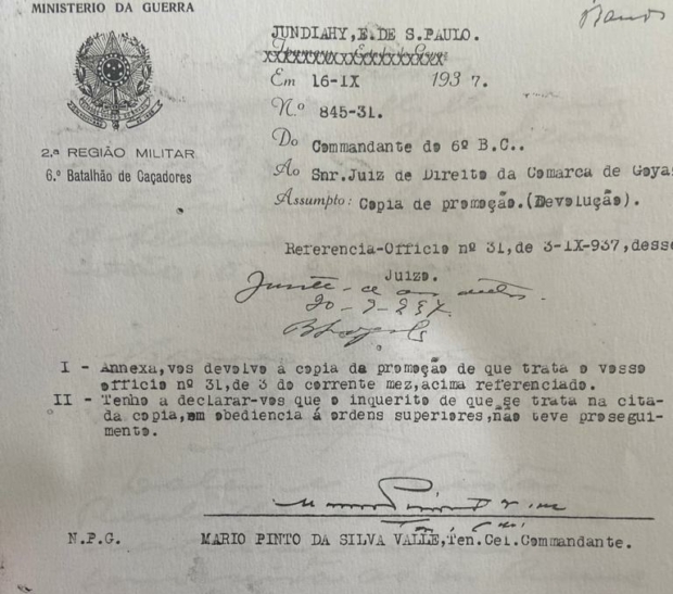 Entretanto, o inquérito verde-oliva também não mereceu melhor sorte, consoante informou de Jundiaí/SP, em 16 de setembro de 1937, o tenente-coronel Mário Pinto da Silva Valle ao magistrado da comarca de Goiás: “Tenho a declarar-vos que o inquérito de que se trata na citada cópia, em obediência à ordens superiores, não teve prosseguimento.”