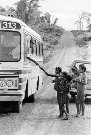 Mas as ambições fotográficas do repórter Orlando Brito iam muito além da corte. Numa foto mostra indígenas Panará recebendo alguma coisa de um motorista de um ônibus (cujo nº 313 inclui o número trágico, o azar: 13), em 1974. Empobrecidos, o que recebem? Parece algum tipo de comida, talvez bolacha, ou, quem sabe, dinheiro.