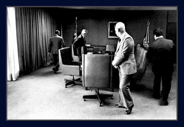 A fotografia é de Orlando Brito, que morreu em Brasília na sexta-feira, 11, aos 72 anos, de complicações derivadas de uma cirurgia de intestino. Sua percepção de cena, como se fosse um diretor de teatro dos mais sutis, é impressionante. Teria percebido a dança, os políticos falando pelos passos, e não com as bocas, no momento em que fez a fotografia? Não se sabe. Mas o enquadramento perfeito, com detalhes de praticamente todos os personagens — só não se tem os passos de Golbery, que fala com as mãos, como se dissesse: “Este governo me dá urticária”.