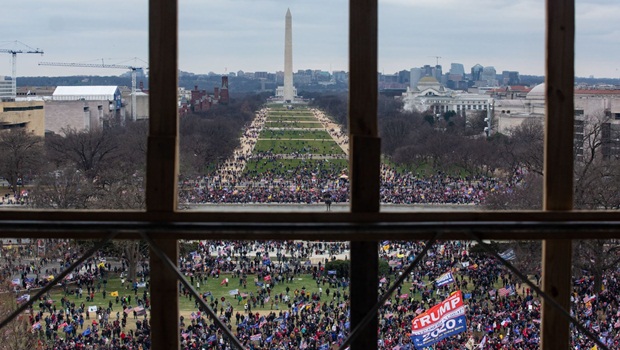 Em seguida à invasão ao Capitólio, em Washington (DC), nos Estados Unidos, no final da tarde quarta-feira, 6, imagens começaram a surgir no Facebook com uma multidão que teria tomado a Avenida Pensilvânia, na capital federal norte-americana, e ocupado os arredores do Congresso do país. A imagem acima, fotografada por Cheriss May para o Getty Images, é um registro daquele momento em que extremistas da supremacia branca, com bandeiras pró-Trump, nazismo, conspiracionismo e outras ideologias racistas, quebraram vidraças e impediram violentamente por horas a sessão que confirmou a vitória eleitoral de Joe Biden em 2020.