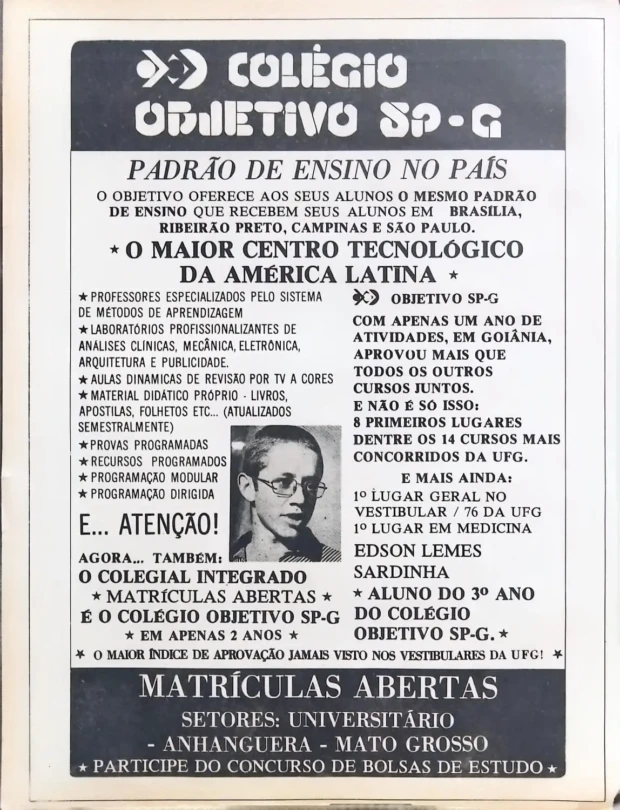 O colégio paulistano não deixou barato. Duas semanas depois, na edição nº 7 (01/02/1976), publicou um anúncio de impacto com a fotografia de Edson Lemes Sardinha, aluno do 3º ano do Objetivo. Sardinha havia conquistado o 1º lugar geral no vestibular da UFG de 1976 e o 1º lugar em Medicina — um feito que funcionava como resposta direta à celebração dos “goianos vencedores” do Carlos Chagas.
