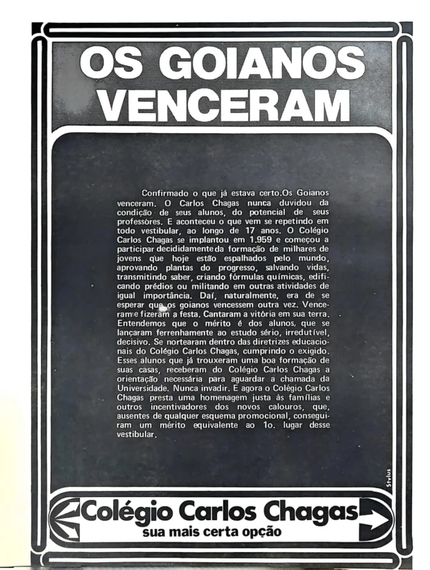 Na edição nº 5, de 18 de janeiro de 1976, o Colégio Carlos Chagas estampou uma página inteira com o anúncio “Os goianos venceram”, produzido pela Stylus Propaganda. O texto celebrava seus aprovados — e, não por acaso, lançava uma indireta elegante ao recém-chegado concorrente: o Colégio Objetivo SP-G, importado de São Paulo e já chamando atenção com seu modelo agressivo e tecnológico de ensino.