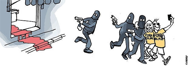 Mas uma grande cartunista, como Larte, às vezes pisa na bola? Sim. Em fevereiro de 2017, demonstrando parcialidade, num charge publicada na “Folha”, Laerte mostra três indivíduos encapuçados e armados, criminosos por certo, abraçados, em aparente congraçamento, com duas pessoas, não-mascaradas, que comemoram o “Fora Dilma” (expresso nas camisetas). Os criminosos supostamente “mataram” alguém — quiçá a democracia, ou o governo do PT —, pois há sangue escorrendo no chão. Laerte poderá dizer que se trata apenas de humor. Acredito que se trata mesmo de humor, mas é humor engajado, ideologizado, de crítica àqueles que contribuíram para o afastamento da presidente da República. Noutras palavras, fica-se com a impressão de que Laerte “criminaliza” aqueles que derrubaram a petista. Laerte, como chargista, pode ter uma posição sobre os fatos e expressá-lo na sua arte? Claro que sim. E, se criticada, pode se defender, mas dificilmente terá condições de contrapor que sua charge é uma crítica autônoma, livre de peias ideológicas.