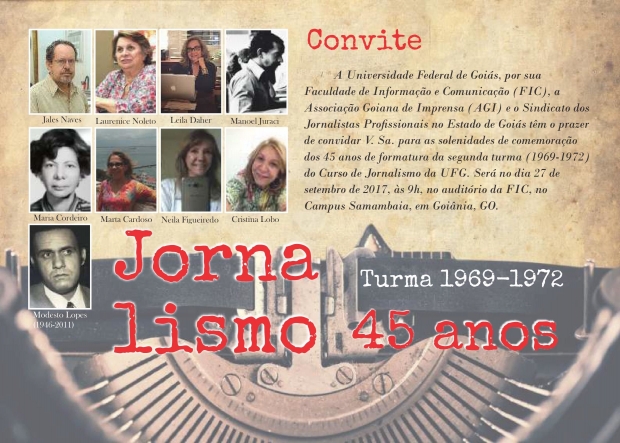 A segunda turma do Curso de Jornalismo da Universidade Federal de Goiás (1969-1972) vai promover na quarta-feira, 27, a partir das 9h, no auditório da Faculdade de Informação e Comunicação da UFG, no Campus Samambaia, três eventos para comemorar os 45 anos de formatura: homenagem aos pioneiros na criação do Curso; palestra/debate sobre tema da atualidade; e lançamento da segunda edição do livro “Contribuição à História da Imprensa Goiana”, de José Lobo, de 1949.
