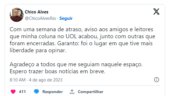 “Com uma semana de atraso, aviso aos amigos e leitores que minha coluna no UOL acabou, junto com outras que foram encerradas”, relatou Chico Alves numa rede social.