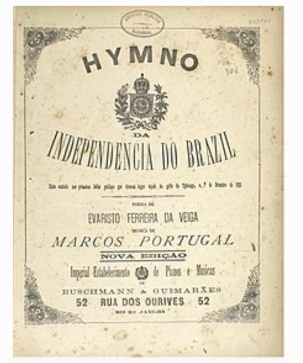 Já a letra do Hino Constitucional Brasiliense com música de Marcos Portugal, foi publicada pela Typographia do Diário, em 1822, conforme documentação do arquivo Nacional.