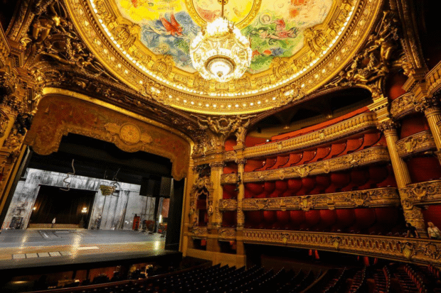 Por fora, a fachada em estilo neobarroco exibe colunas, frisos, esculturas. Por dentro, a opulência dos veludos, dourados e espelhos faz com que cada visitante se sinta como se estivesse entrando num sonho. No centro da sala de espetáculos, um candelabro de mais de seis toneladas coroa a plateia. Acima dele, uma pintura do teto feita por Marc Chagall, em 1964, se sobrepõe à original de Jules Lenepveu – gesto polêmico que ainda hoje suscita debates.