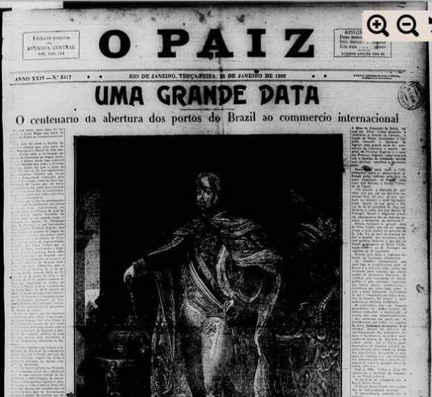 O jornal “O Paiz” trazia na primeira página de sua edição do dia 28 de janeiro de 1908 a lembrança do centenário da abertura dos portos. Além da foto da imagem de Dom João VI, o jornal trazia também um texto apontando a importância de tal fato para a nossa história. A vinda da família real portuguesa para o Brasil mudou a rotina da colônia portuguesa e traçou os rumos da nossa independência.