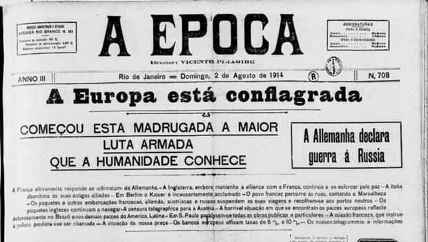 O jornal “A Epoca” (sem acento agudo), do dia 2 de agosto de 1914, informava: “Infelizmente, é inevitável a conflagração europeia. Os primeiros despachos telegráficos, conquanto mostrassem desde logo a gravidade da situação, eram, entretanto, de molde a justificar a esperança de que o conflito viesse a ser evitado. Os fatos posteriores, porém, vieram colocar a questão noutro pé, tornando impossível a solução pacífica. A Alemanha enviou ontem à Rússia e à França um ultimatum cujos termos, até a hora em que estas linhas são escritas, não são bem conhecidos. Mas, para que se avalie uma das consequências desse ultimatum do governo alemão, basta que se conheçam os termos da resposta que ao mesmo deu o governo francês: ‘A França está disposta a invadir o território da Alemanha, tão depressa se tenha completado a mobilização de suas forças’”.