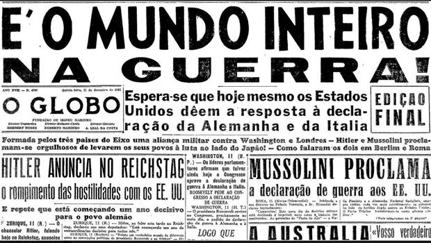 O embaixador do Brasil nos Estados Unidos, Carlos Martins Pereira e Souza, enviou uma nota reforçando o apoio do governo aos norte-americanos após a declaração de guerra do Eixo. Outros países latinos fizeram o mesmo. O ano de 1941 terminava com a Segunda Guerra espalhada pelo mundo. Até hoje dá um frio na barriga só de ler uma manchete igual a que saiu na edição vespertina do Globo.