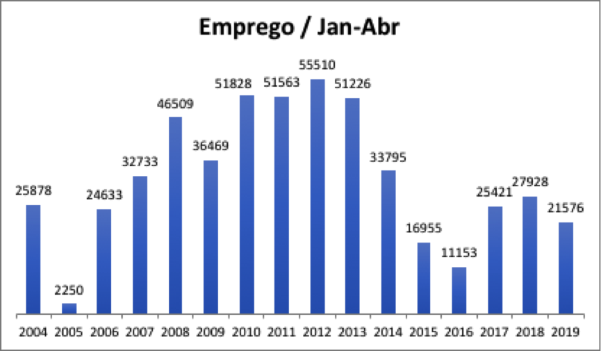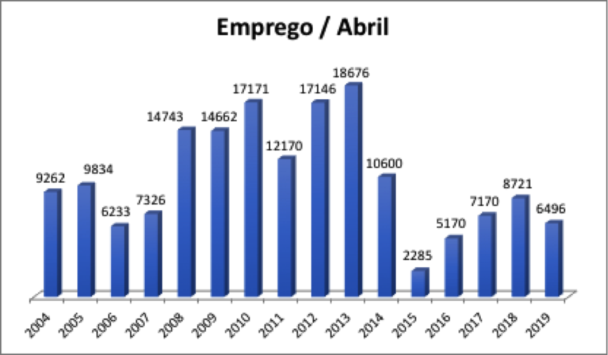 Primeiro, comparemos abril de 2019 com abril de 2018. No ano passado, nesse mês, o saldo de empregos foi de 8.721. Ou seja: houve uma diminuição de 25,5% no número de postos de trabalho com carteira assinada este ano. Em abril de 2019, a agropecuária e a indústrias de transformação contrataram menos e demitiram mais que no mesmo período do ano passado.