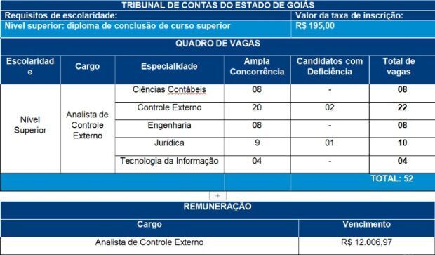 Começa nesta segunda-feira, 26, a partir das 16h, o período de inscrições para o concurso público que oferece 52 vagas para o cargo de Analista de Controle Externo no Tribunal de Contas do Estado de Goiás (TCE-GO). O salário inicial para o cargo é de R$ 12.006,97, com carga horária de 6 horas diárias. Os interessados devem acessar o site da Fundação Getúlio Vargas (FGV), que é a banca organizadora do concurso, até as 16h do dia 8 de abril para efetuarem suas inscrições.