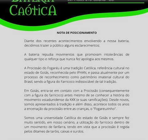 Na ocasião, a imagem de um farricoco – personagem emblemático da Procissão do Fogaréu, uma tradição da Cidade de Goiás – presente nos instrumentos da bateria foi mal interpretado. “Somos uma universidade católica do estado de Goiás e sempre fez muito sentido, em nosso cenário, a utilização do farricoco dentro de um movimento de fanfarra”, declarou a nota. Confira: