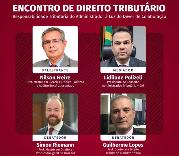 Nesta quinta-feira, 31, o Sindifisco-GO, a Affego, a OAB/GO, a Escola Superior de Advocacia de Goiás (ESA/OAB) e a Comissão de Direito Tributário da OAB/GO organizarão o “Encontro de Direito Tributário”. O evento acontecerá no auditório da ESA/GO, localizado no Setor Sul, em Goiânia e terá início com uma palestra do advogado tributarista e auditor-fiscal aposentado da Receita Estadual de Goiás, Nilson Freire. O tema será “Responsabilidade Tributária do Administrador à Luz do Dever de Colaboração”.