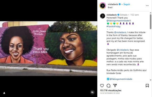 O trabalho do grafiteiro também já foi compartilhado por outra atriz internacional. Viola Davis se encantou com um grafite que mostrava uma menina de cabelos crespos, representada pela copa de uma árvore, e compartilhou o desenho.
