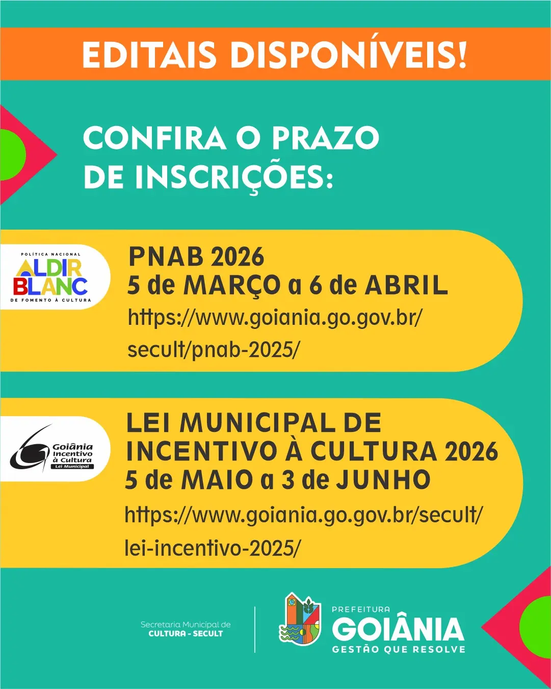 Informações detalhadas sobre os editais, critérios de participação, prazos e formas de inscrição estão disponíveis na página oficial da Secretaria Municipal de Cultura, no site da Prefeitura de Goiânia.