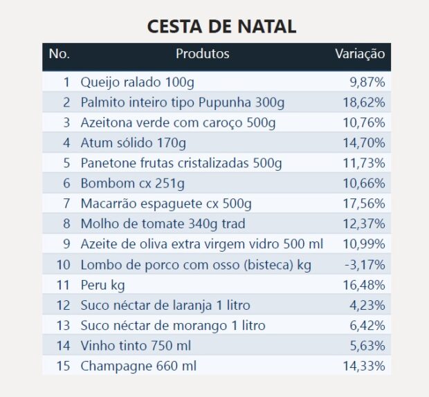 O palmito inteiro foi o maior responsável pelo reajuste, com um aumento de 18,62%, seguido pelo espaguete (17,56%) e peru (16,48%). Entre as bebidas, o champagne se destacou, tendo apresentado aumento de 14,33%. Já o panetone de frutas cristalizadas, muito procurado nesta época do ano, está 11,73% mais caro.