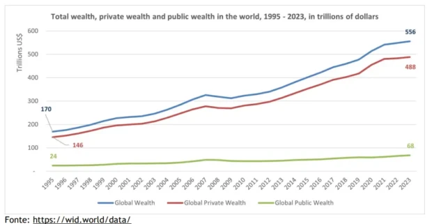 Entre 1995 e 2023, a riqueza privada global cresceu US$ 342 trilhões – 8 vezes mais que a riqueza pública global, que aumentou apenas US$ 44 trilhões. A riqueza pública global – como parcela da riqueza total – na verdade diminuiu entre 1995 e 2023.