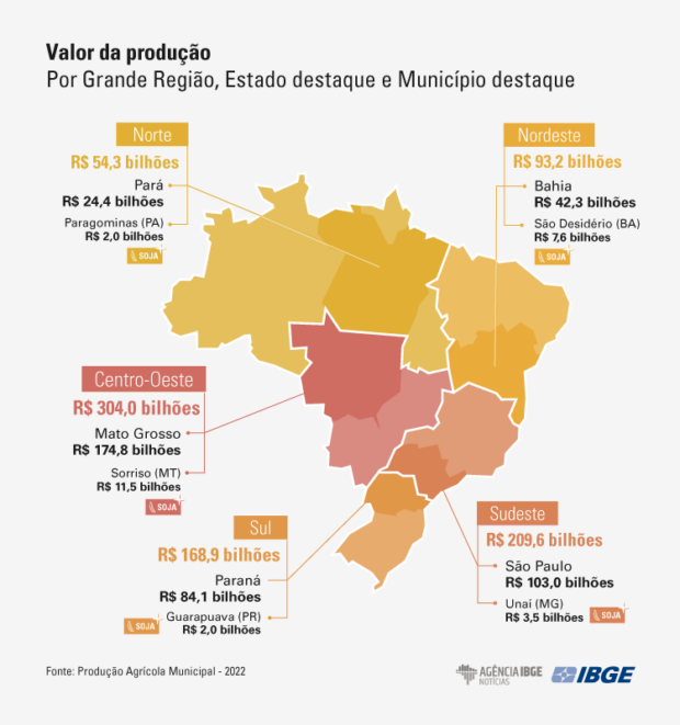 Segundo o IBGE, com um total de 120,7 milhões de toneladas, a produção de soja caiu 10,5% em 2022, mas o valor da produção cresceu 1,3%, chegando a R$ 345,4 bilhões. Entre os municípios, os maiores produtores foram Sorriso (MT), com 2,1 milhões de toneladas, Rio Verde (GO), com 1,64 milhões de toneladas, e Formosa do Rio Preto (BA), com 1,58 milhões de toneladas.