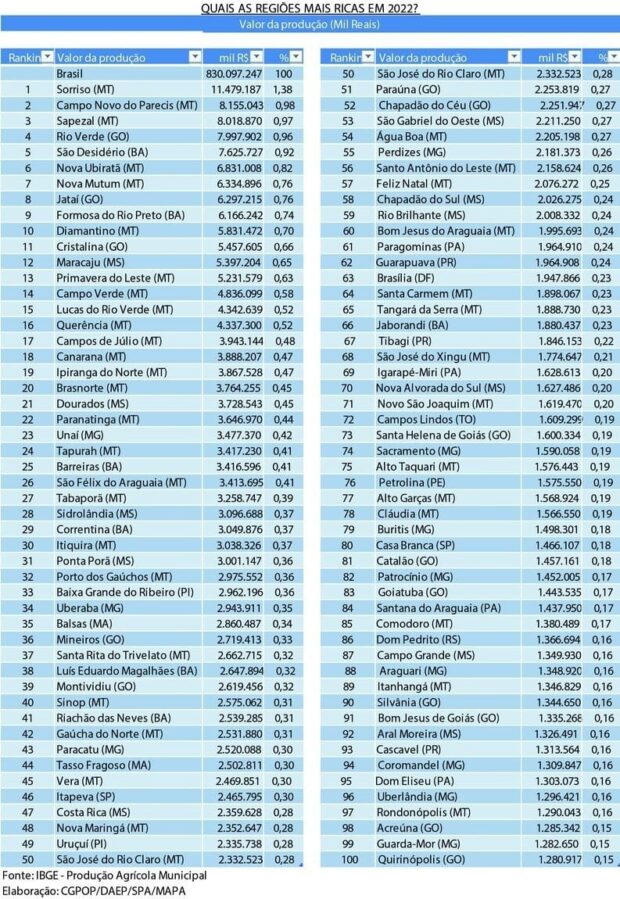 Os municípios de Rio Verde, Jataí e Cristalina, em Goiás, estão entre as 15 cidades mais ricas do agronegócio brasileiro. A análise foi feita pelo Ministério da Agricultura e Pecuária (Mapa), que identificou os 100 municípios mais ricos do Brasil no agronegócio, a partir da pesquisa anual do IBGE da Produção Agrícola Municipal (PAM).