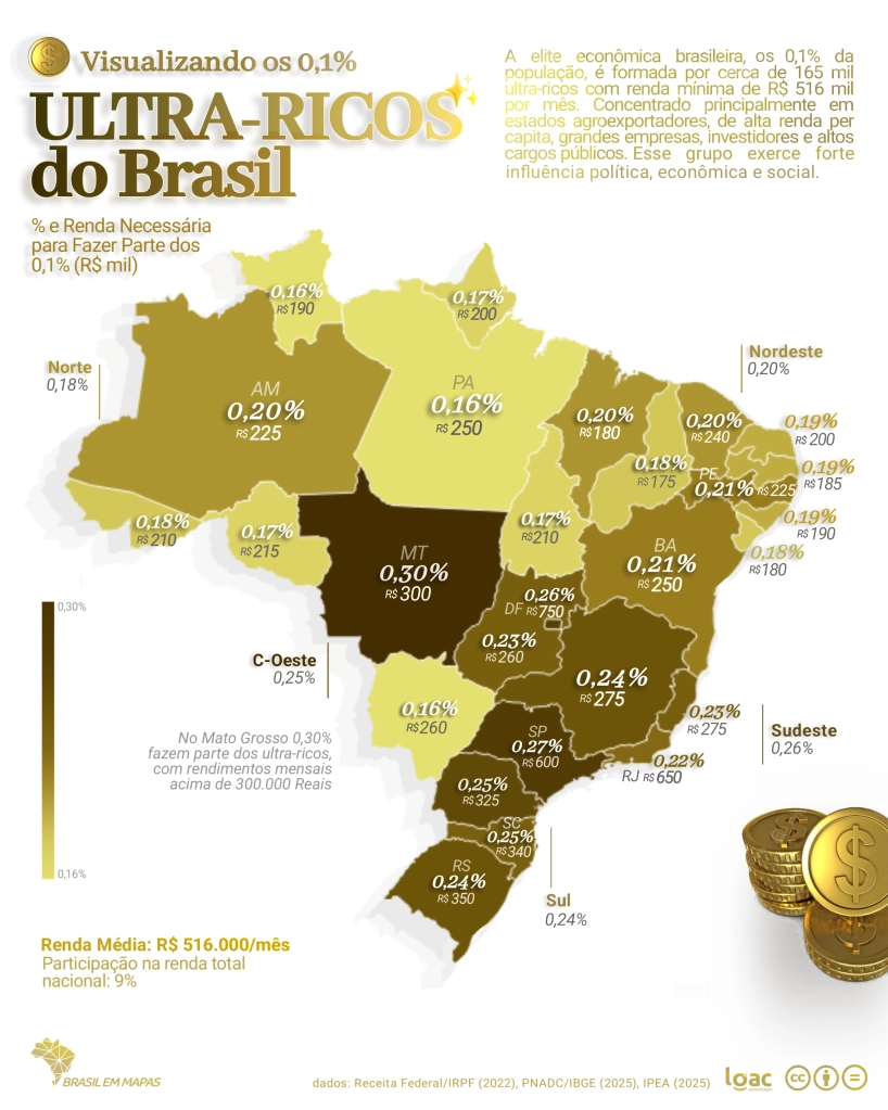 Apesar de Mato Grosso ter a maior proporção de super-ricos, o valor necessário para ingressar no grupo (R$ 300 mil/mês) é menos da metade do exigido em estados como o Distrito Federal (R$ 750 mil/mês), Rio de Janeiro (R$ 650 mil/mês) e São Paulo (R$ 600 mil/mês).