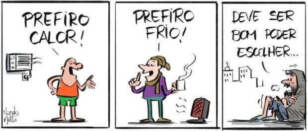 Recentemente, o chargista Nando Motta publicou um quadrinho sugestivo. Um homem, de camiseta cavada, diz: “Prefiro calor!”. Outro homem, de blusa de frio, cachecol e gorro, postula: “Prefiro frio!” Um mendigo, com roupas e um cobertor puídos, afirma, num realismo implacável: “Deve ser bom poder escolher…”.