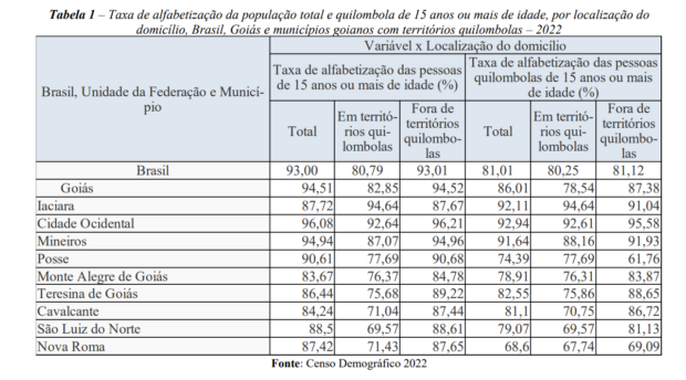 Em Goiás, o Censo Demográfico 2022 mostra que 94,5% das pessoas com 15 anos ou mais sabem ler e escrever. Entretanto, apenas 86,0% dos quilombolas na mesma faixa etária disseram que são alfabetizados. A taxa de alfabetização é mais alta fora das áreas quilombolas, com 87,4%, enquanto dentro dessas áreas a taxa é de 78,5%.