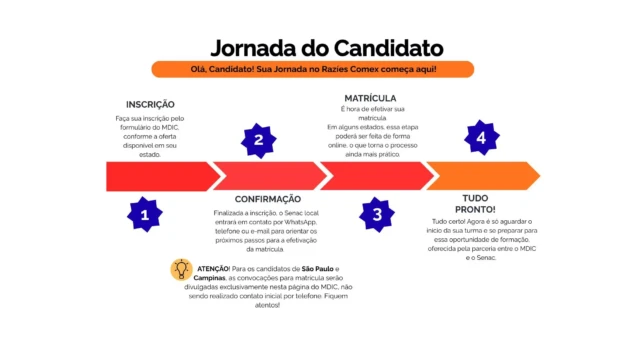 No caso específico de São Paulo e Campinas, a convocação para matrícula será divulgada exclusivamente na página do MDIC, sem contato inicial por telefone. Já em Goiânia, os candidatos receberão as orientações diretamente do Senac para efetivar a matrícula, que poderá ocorrer de forma presencial ou online, dependendo da organização local.