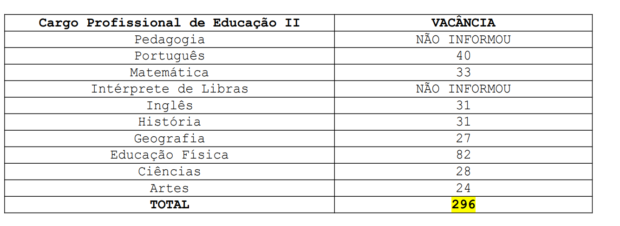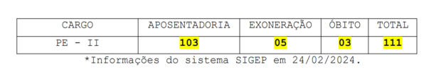 Já as vagas abertas com exoneração, falecimento e óbitos para o cargo de PE-II (sem especificar as áreas), foram: