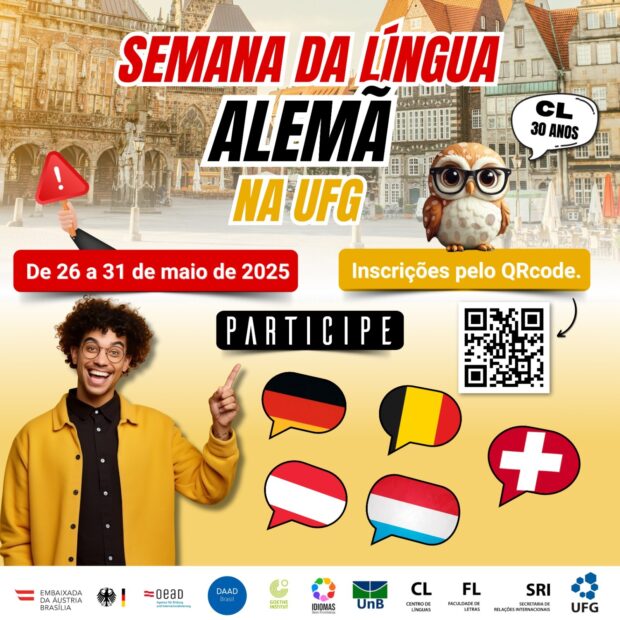 Na sequência das atividades com Cesare Lievi, a UFG realiza, entre os dias 26 e 31 de maio, a Semana da Língua Alemã, iniciativa promovida pelo Centro de Línguas da Faculdade de Letras em parceria com a AEBA-GO e instituições internacionais como o DAAD e o Goethe-Institut. A programação busca valorizar o idioma e as culturas dos países de língua alemã por meio de eventos presenciais e virtuais voltados para o público acadêmico e a comunidade externa.