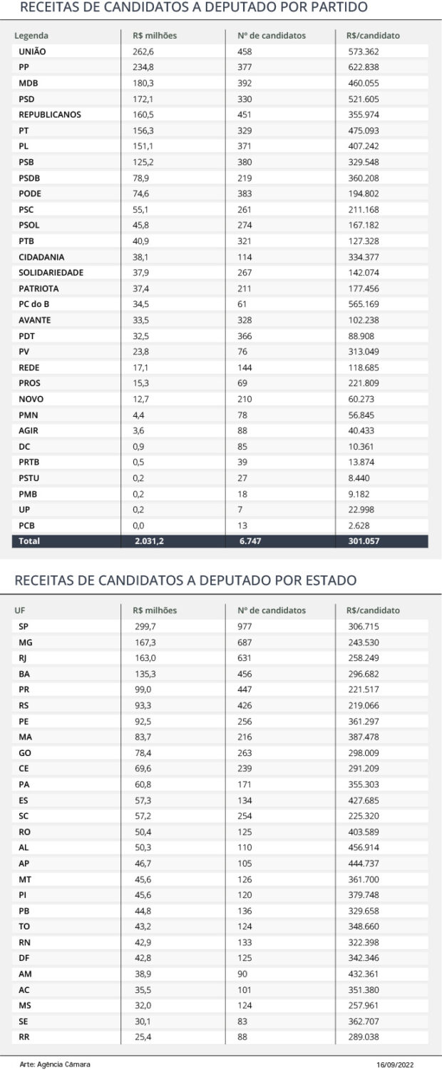 O União Brasil é o partido com a maior receita declarada, somando R$ 262,6 milhões declarados por 458 candidatos. A média de receita é de R$ 573 mil por deputado. Em seguida, aparecem o PP (R$ 234,8 milhões), o MDB (R$ 180,3 milhões), o PSD (R$ 172,1 milhões) e o Republicanos (R$ 160,5 milhões).