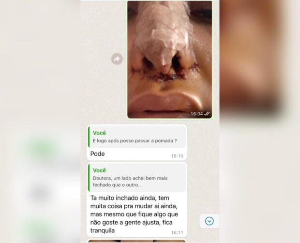 Em um dos textos, uma cliente disse que estava “desesperada” e com “os olhos irritados”. Outro paciente denunciou ter ficado com o nariz “aleijado” e “um buraco com queloide”. Nas conversas, os dentistas da clínica da investigada chegaram a chamar os pacientes para fazer um “reparo”, assim como ocorreu com Aline.