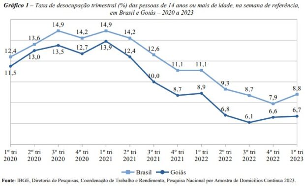 De acordo com os dados da Pesquisa Nacional por Amostra Domiciliar Contínua (PNAD Contínua), a taxa de desocupação em Goiás foi de 6,7% no primeiro trimestre de 2023, indicando estabilidade estatística em relação ao trimestre imediatamente anterior (6,6%). Essa foi a quarta taxa seguida que fica abaixo do patamar de 7,0%.