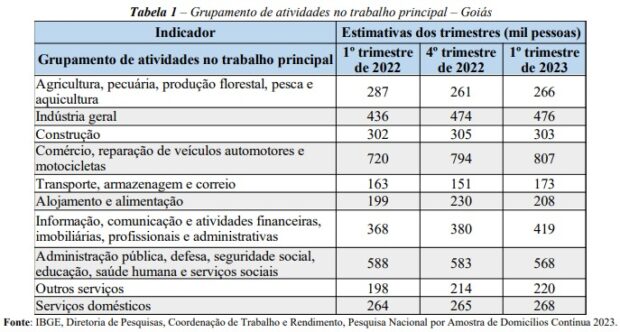 Em relação ao mesmo trimestre de 2022, houve aumento de 12,1% de pessoas ocupadas no grupo da Comércio, reparação de veículos automotores e motocicletas, passando de 720 mil para 807 mil pessoas no primeiro trimestre de 2023. Também houve aumento no grupo da Indústria geral, que subiu 9,3%, passando de 436 mil pessoas para cerca de 476 mil.